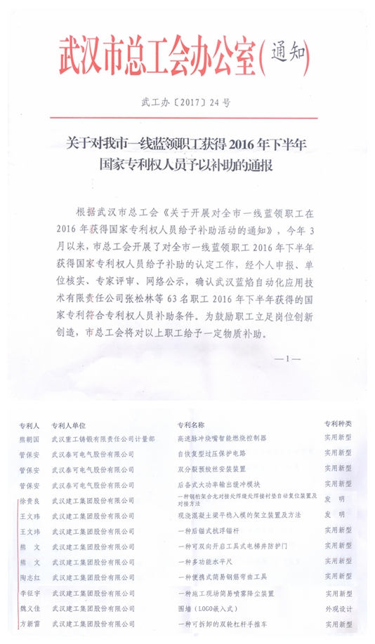 為鼓勵(lì)職工立足崗位創(chuàng)新創(chuàng)造,近日武漢市總工會(huì)對(duì)2016年下半年獲得國(guó)家專利權(quán)的一線職工發(fā)放了專利補(bǔ)助。經(jīng)過(guò)個(gè)人申報(bào)、單位核實(shí)、專家評(píng)審、網(wǎng)絡(luò)公示,全市共確認(rèn)了63名具備補(bǔ)助條件的職工,其中武建集團(tuán)的徐貴良、熊文、王文瑋等7位員工取得的《一種鋼桁架合攏對(duì)接處焊縫襯墊自動(dòng)復(fù)位裝置及對(duì)接方法》等9項(xiàng)專利成果入選。